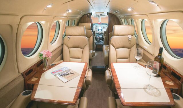 Kabina samolotu King Air 200 jest przestronna i wygodna. Dzięki wysokości sufitu wynoszącej 4,8 stopy pasażerowie czują się jak w domu. Może pomieścić do 8 pasażerów i posiada rozkładane skórzane fotele. Konfigurację siedzeń można zmienić, aby zapewnić dodatkową przestrzeń na nogi lub ułatwić dyskusje grupowe.