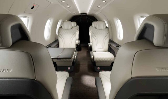 Obrotowe fotele i wykończenia inspirowane odrzutowcem PC-24 gwarantują komfort jak w odrzutowcu, z dużą przestrzenią na nogi, wysuwanymi półkami i bezpośrednim dostępem do ciśnieniowego przedziału bagażowego, nawet podczas lotu.